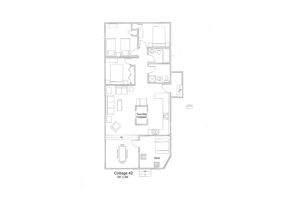This cabin boasts one of the most spectacular views of Mountain Springs Lake and Camelback Mountain. Barbecue from the large wooden deck overlooking the lake or dine indoors in this light-drenched cottage. Enjoy the stunning two-way fireplace from the kitchen and living room. Cabin 42 also features two full baths, air conditioning and a dishwasher.